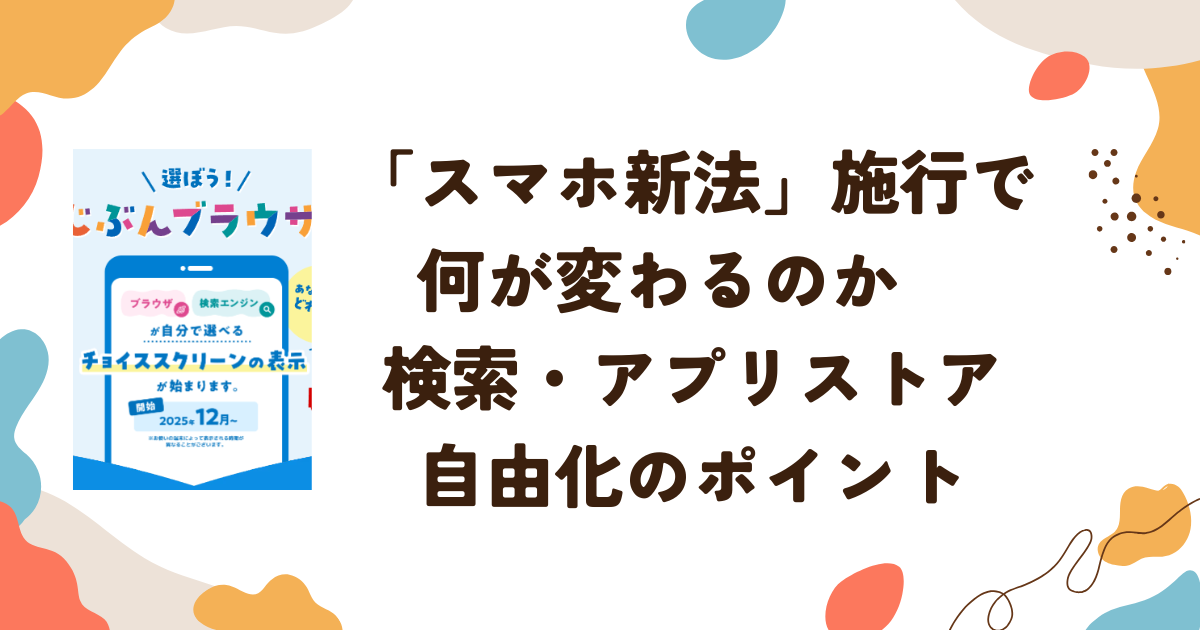 ニュースでは「検索アプリを自由に選べる」「アプリストアの競争が進む」といった前向きな側面が注目されていますが、一般のスマホ利用者にとっては、メリットと同時に注意すべき点も存在する制度です。本記事では、スマホ新法の背景から具体的な変更点、そして利用者目線での影響を整理します。